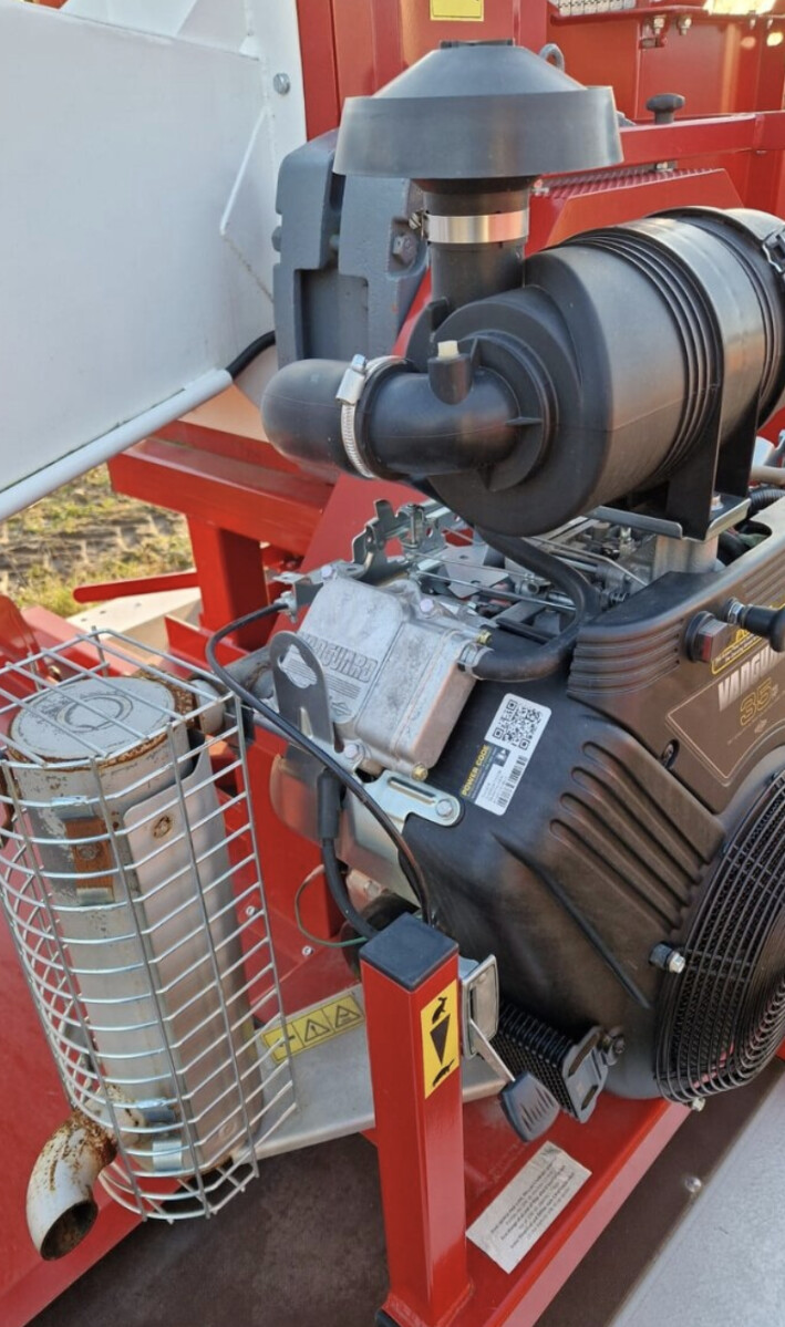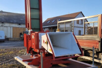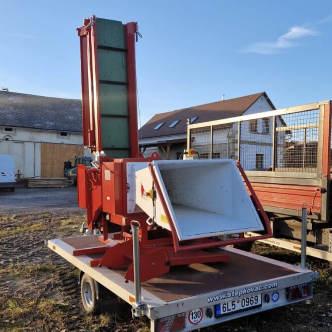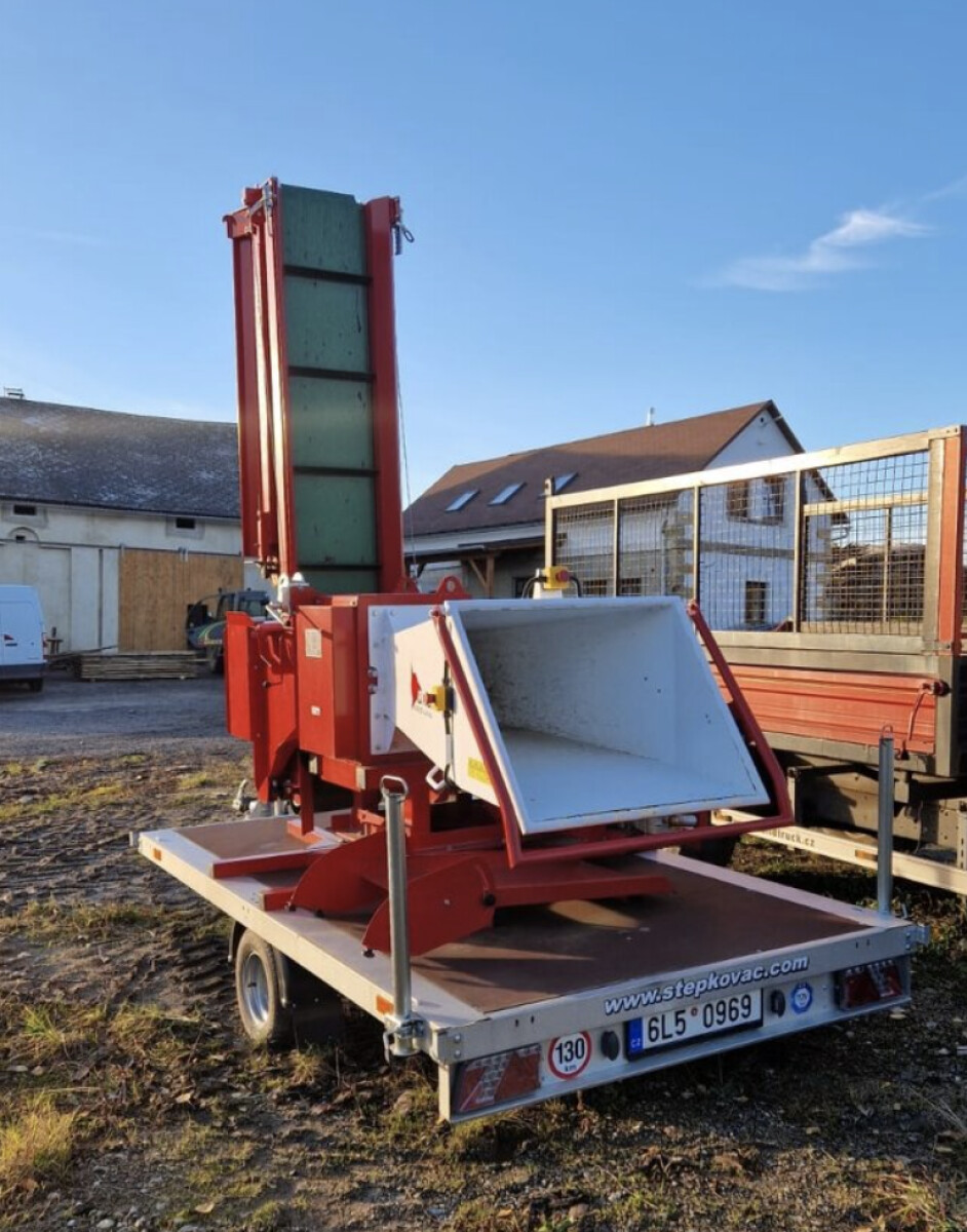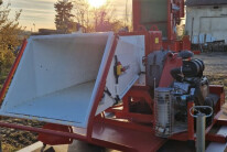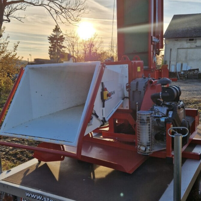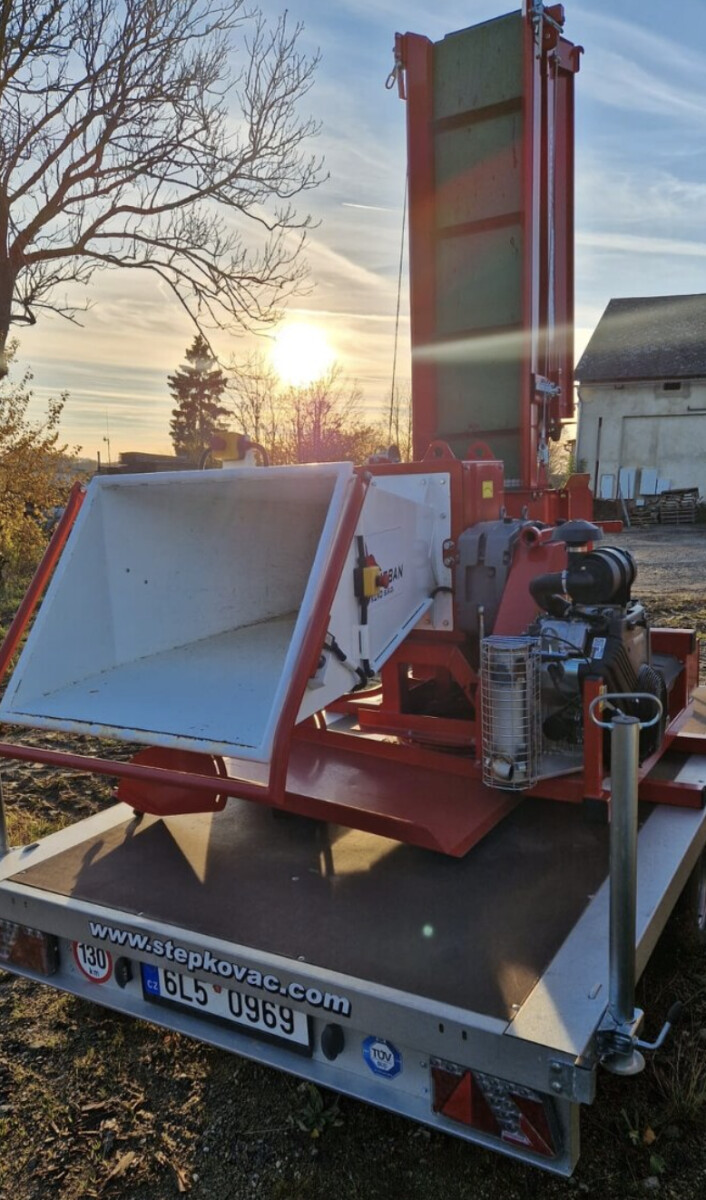 The URBAN SMH110 wood chipper (log splitter) is mobile and powerful. It is powered by a 35 hp Briggs & Stratton VANGUARD engine. The SMH110 has a road chassis with license plates and 13" wheels next to the loading area for easy transport to any location. The wood chipper is mounted on a 360° turntable on the trailer.